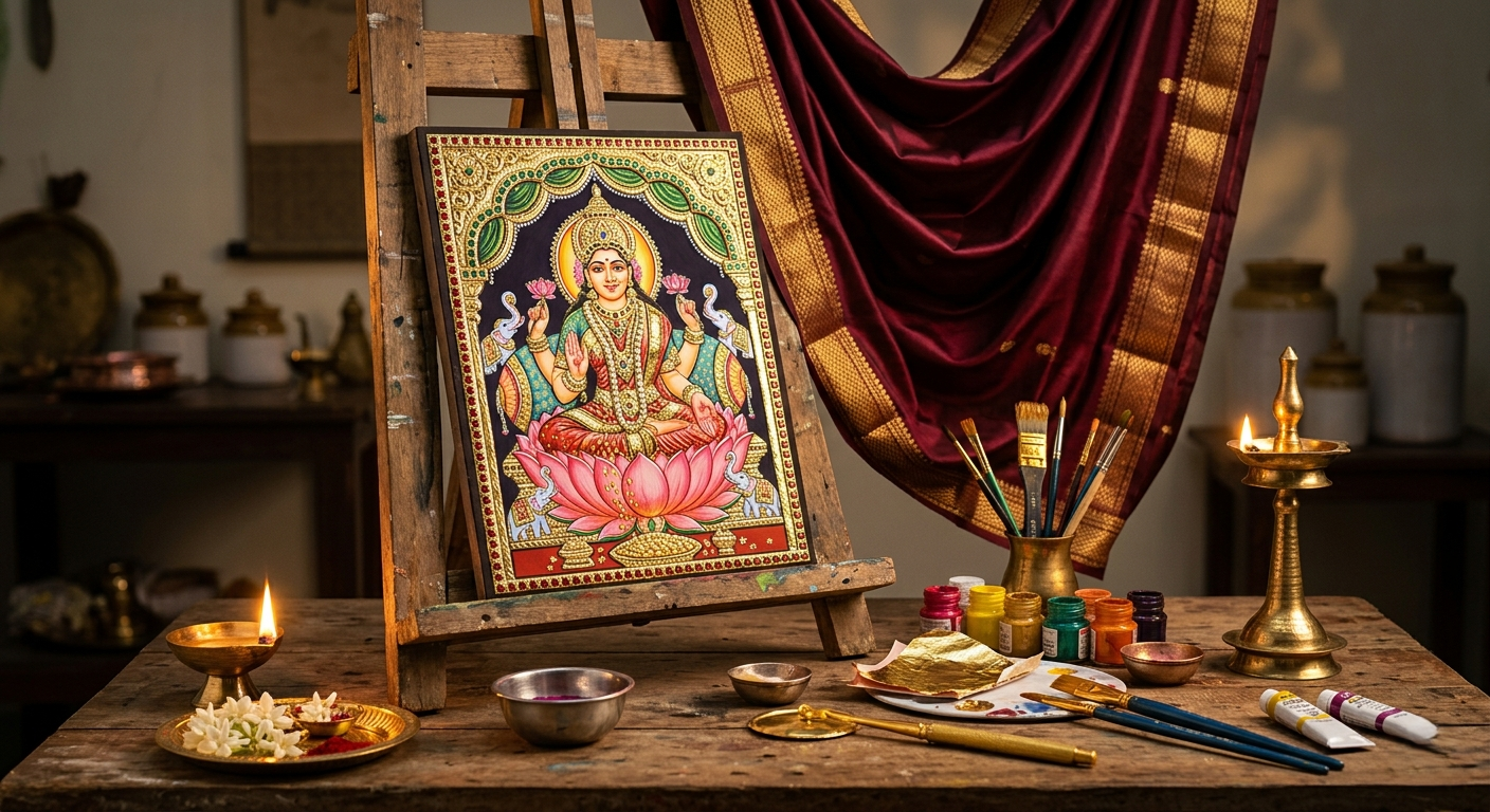 Lakshmi Thanjavur painting order panninen, romba traditional ahum elegant ahum iruku. Quality super, delivery um time ku vandhuduchu. Very happy with purchase.