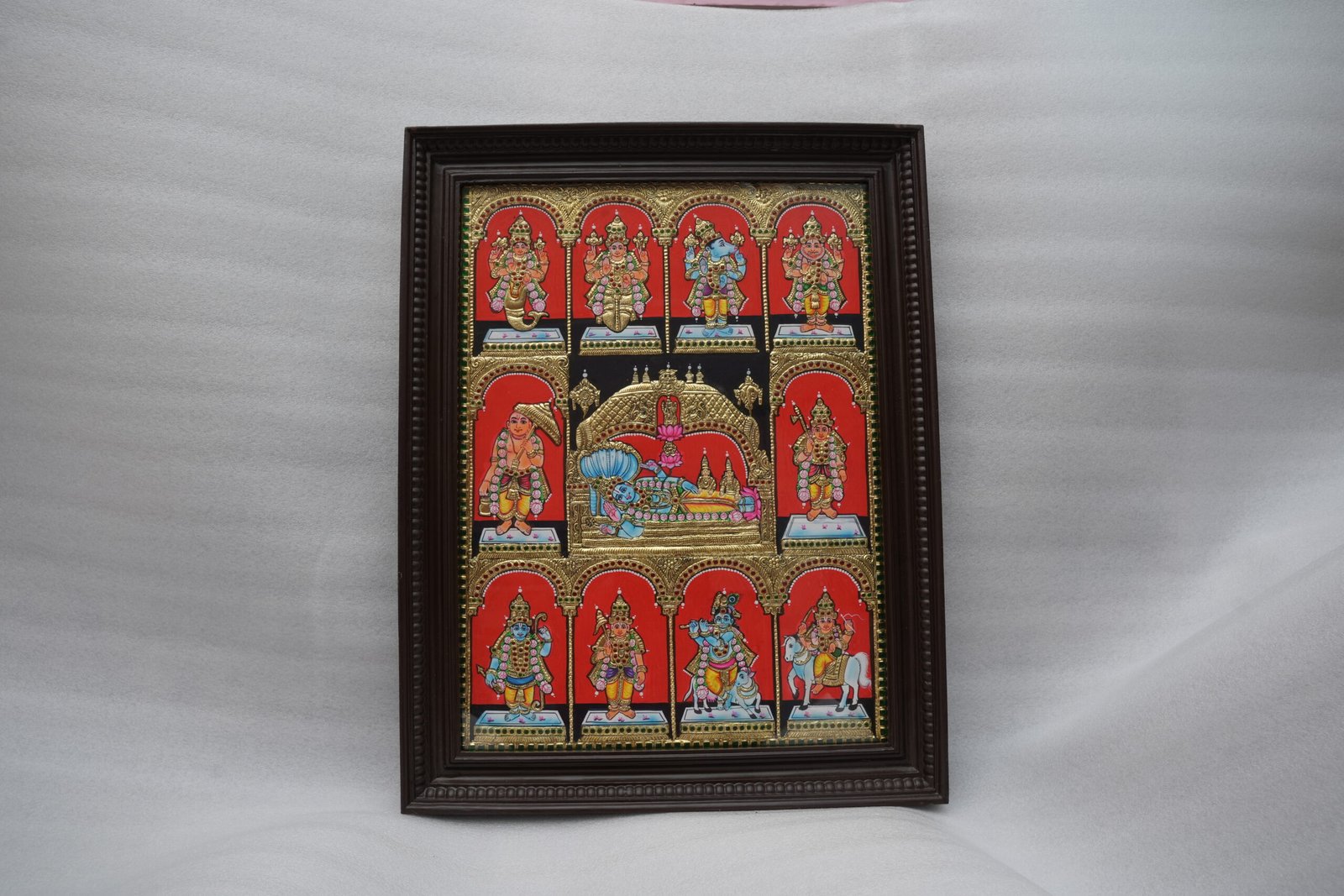 Bring home divine energy and artistic elegance with this exquisite Vishnu Avatharangal Tanjore Painting. Crafted with intricate detailing, rich colors, and traditional gold foil work, this artwork symbolizes joy, prosperity, and the removal of obstacles. A perfect addition to your home décor or a thoughtful